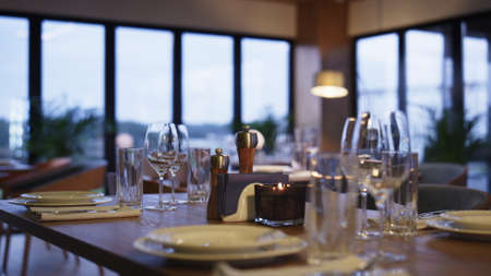 Restaurant interior Empty glasses and cutlery on table