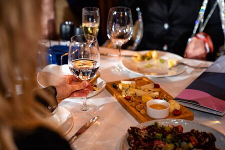 people hands with glasses of wine at the holiday table. raise a toast.