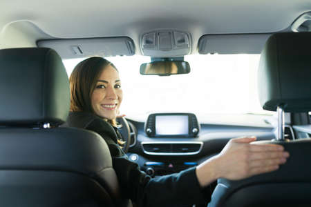 Rear view of an excited businesswoman making eye contact and smiling while sitting behind the wheel of a car. Businesswoman commuting to work