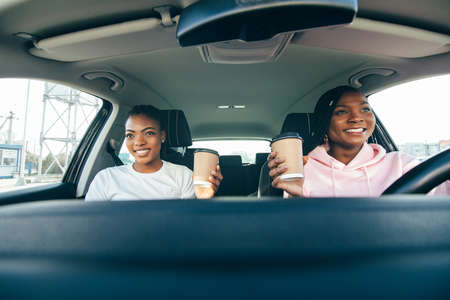 Two african woman drinkink coffee to go in the car while driving car on the road. Transportation