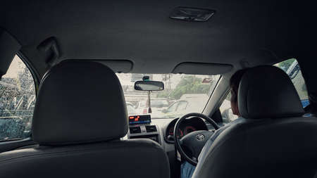 The back of a taxi driver. In a taxi during a trip to a destination with traffic jams. On a rainy day in Bangkok, Thailand