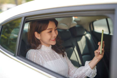 Cheerful Asian mother and daughter sitting in car and touching mobile phone, Going on a trip and different generations senior elderly and teenager concept