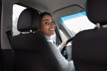 Young woman driving car, trip of business lady in sunny weather. Happy cute young african american female holds steering wheel, turns in auto and talk with friend or client on back seat, empty space