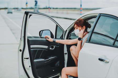 Asian woman wearing protective face mask protection safety before getting out of the car during coronavirus covid-19 outdoor curfew pandemic