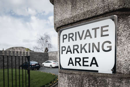 Private Parking Area sign on a stone pillar at the entrance to a car park