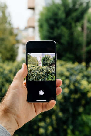 Taking nature photo with phone - Hand holding a smartphone taking pictures of mountain trees. Cellphone photography, capturing nature beauty and hobby photographer tourist concept.