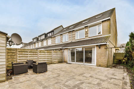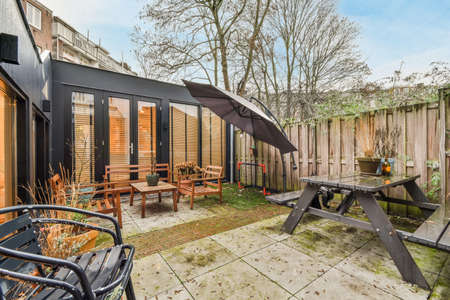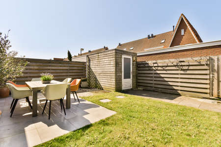 Neat paved patio with sitting area and small garden near wooden fence