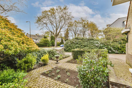View of flower beds, bushes near the house and neighboring brick houses and trees