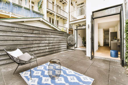 Amazing courtyard of the house with beautifully laid stove and wicker furniture