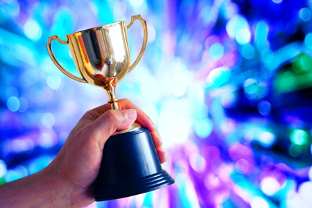 Hand holding up a gold trophy cup as a winner in a competition