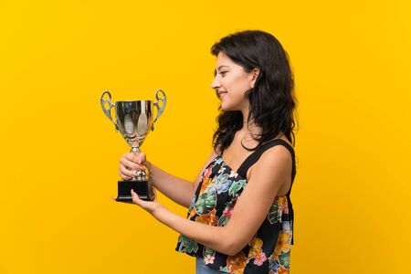 Young woman over isolated yellow background holding a trophy