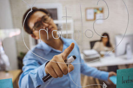 Closeup Asian business man pointing the solution with post notes over the glass wall in office, photo blurred of business woman working with computer,startup and entrepreneur small business concept