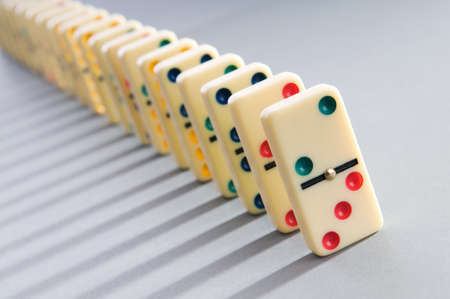 Black dominoes chain on a dark table background. Domino effect concept