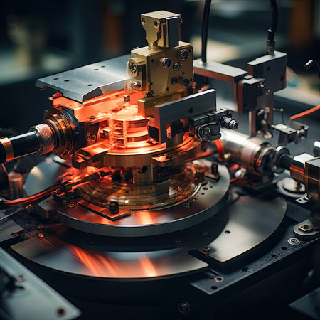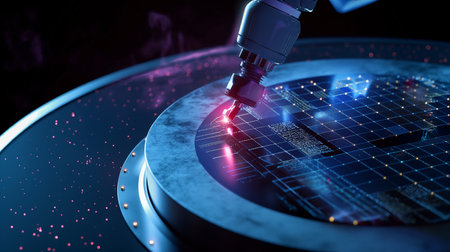 Inside a vacuum chamber, a high-precision laser etches intricate circuits onto a silicon wafer. This close-up image showcases the advanced process of semiconductor manufacturing, a cornerstone of modern technology.