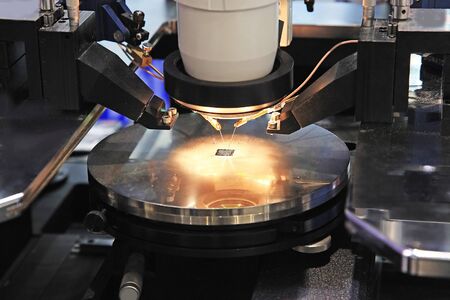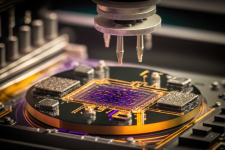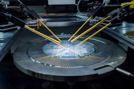 Generative AI Manual probe system for RF test of semiconductor silicon wafers. Selective focus.