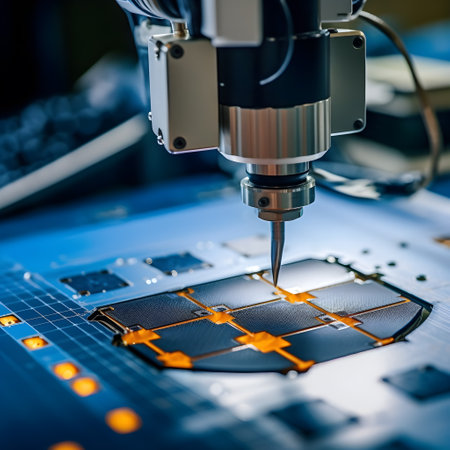 High-tech equipment applies precision techniques to create intricate microchip designs in a laboratory.