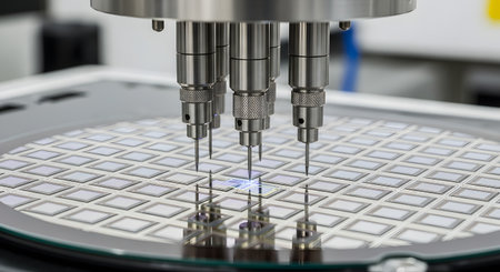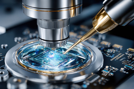 A high-precision probe station testing integrated circuits on a silicon wafer in a cleanroom environment. The metallic needle probes make contact with a microchip to measure its electronic properties, representing semiconductor manufacturing, quality control, and advanced technology.