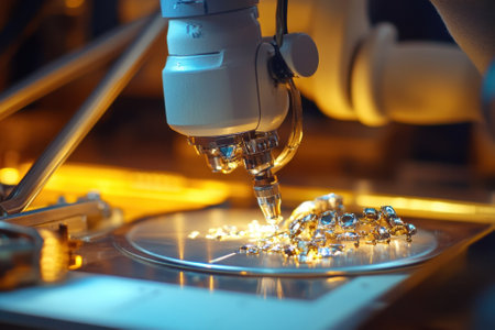 A robotic arm delicately assembles fine jewelry, showing precision craftsmanship in a workshop.