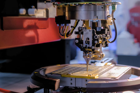 microelectronics chip Factory workspace machine robot production mechanic conveyor photo close view professional studios light