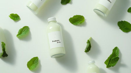 Several glass bottles of probiotic yogurt drink are arranged on a white surface, interspersed with fresh mint leaves, creating a refreshing and healthy image