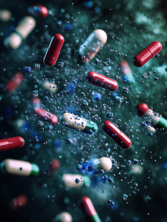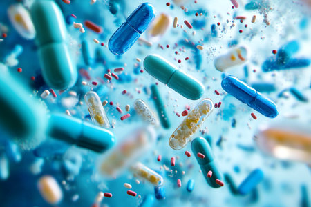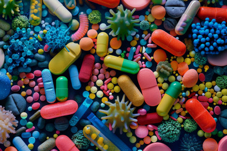 Colorful pills orbit and conflict with bacteria, representing significant achievements in medical science and the fight against infections.