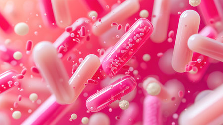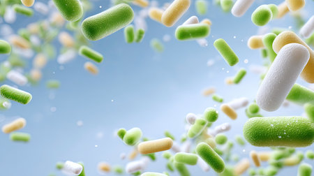 Floating pills, probiotics, and vitamin capsules levitating against a clean blue background, creating a modern and futuristic visual. Ideal for health, wellness, and pharmaceutical-themed.