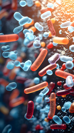 Colorful microscopic view of various bacteria microorganisms and cells showing diversity and complex structures in scientific research concept