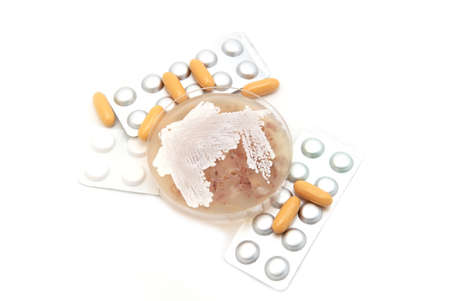 bacteria Streptomyces on agar plate and pills over white background
