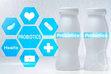 Small bottles with probiotics and prebiotics dairy drink on white background. Production with biologically active additives. Fermentation and diet healthy food. Bio yogurt with useful microorganisms.