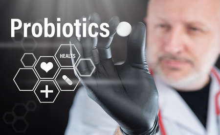 Probiotics in medicine. The doctor is holding a pill next to the word probiotics. Probiotics and prebiotics. Prevention of dysbacteriosis.