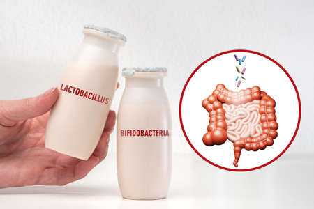 Lactobacillus and bifidobacteria. Bifidobacteria small bottle. Beneficial probiotics for intestines. Lactobacillus acidophilus. Lactobacillus in human hand. Yoghurt concept with beneficial bacteria