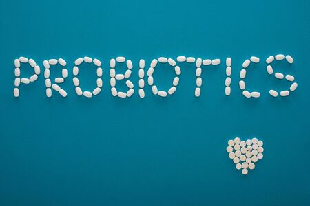 top view of probiotics lettering and heart made of pills on blue background