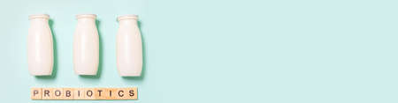 Small bottles with probiotics prebiotics dairy drink on blue background. Production with biologically active additives. Fermentation, diet healthy food. Bio yogurt with useful microorganisms. Banner