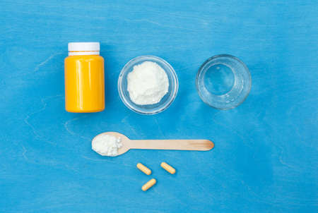 Collagen powder for the preparation of a medicinal mixture, a jar for pills, and a glass of water on a blue background. top view, horizontal