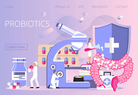 Tiny doctors give stomach probiotic bacteria, lactobacillus. Healthcare landing page, immunity support concept vector for horizontal banner, poster, flyer, website. Symbol of useful milk
