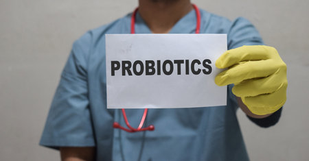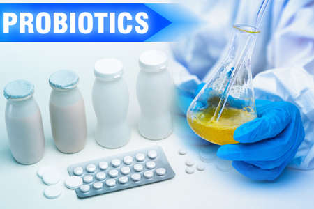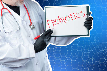 Treatment with probiotics. Inscription probiotics next to doctor. Use of biological additives. Concept - selling probiotics. Development biological drugs. Medical research. Microorganisms. Bacteria