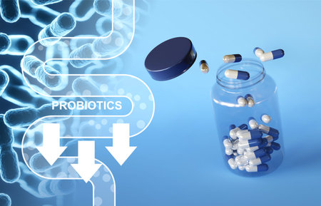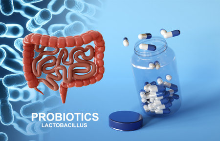 Probiotic supplement pills with lactobacillus bacteria to help support digestion, immune system and gastrointestinal tract. Good gut health concept.