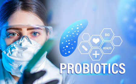 The study of the properties of probiotics. The girl is a microbiologist next to the word Probiotics. Logo of probiotics and a doctor in a protective mask.