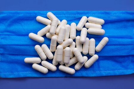 pills lie on a medical protective mask, medical concept of the fight against coronavirus
