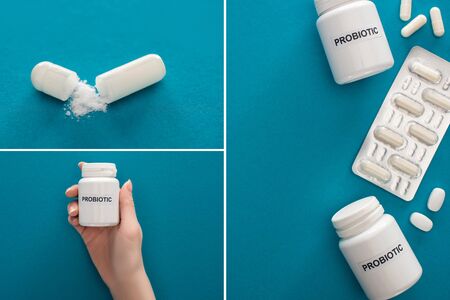 collage of female hand, containers with probiotic lettering, pills and blister pack on blue background