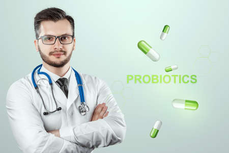 Probiotics in medicine. The doctor is holding a pill next to the word probiotics. Probiotics and prebiotics. Prevention of dysbacteriosis.