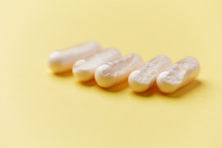 Group of white capsules on yellow background with copy space for text.