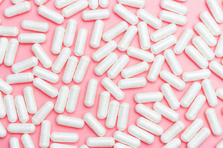 Top view of white pills on pink background with copy space. Healthcare, medical and pharmaceutical concept.