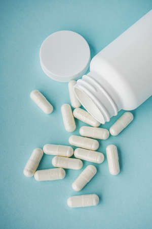 White capsules are isolated on a blue background. Top view with space for copying. The concept of medicine. Close-up, selective focus