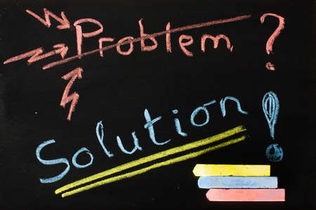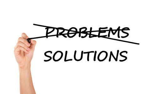 The words problem and solution are standing on orange and blue colored paper, brainstorming for new ideas, hands holding the message