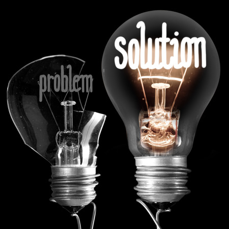 Photo of light bulbs with shining fibers in a shape of PROBLEM and SOLUTION concept isolated on black background