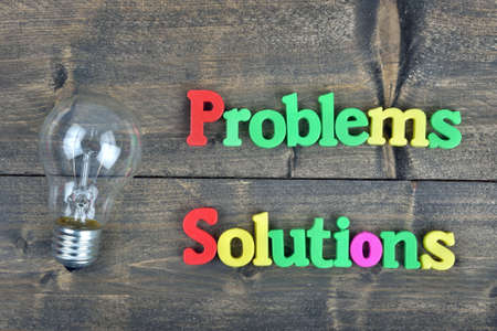 Problems and Solutions words letter, written on notepad, work desk top view. Motivational business typography quotes concept