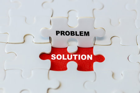 Hand holding a puzzle with the word solution. There is a matching puzzle next to it with the word problem. All problems can be solved. Problem solution