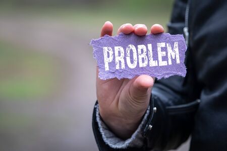 Problem solution concept - hand holds wooden block with the inscription. Close up.