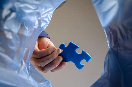 The hand throws the blue puzzle into the trash. A man holds puzzle piece over an trash can. Bottom view. Indoors